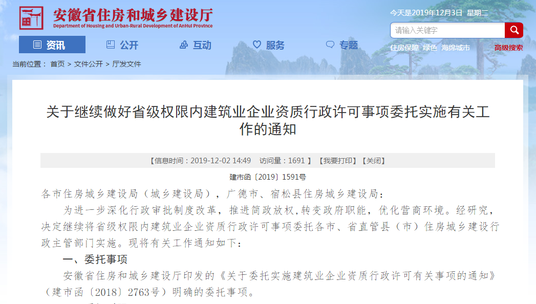 關于繼續做好省級權限內建筑業企業資質行政許可事項委托實施有關工作的通知(2019-12-3)
