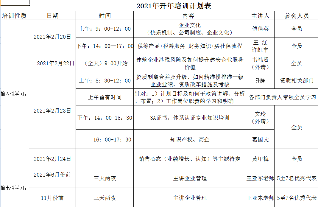 新年伊始,萬象更新,鞭炮映日,開工起航!為迎新年新氣象,賦能打好第一槍,2月20日安徽萬業2021年開年培訓正式開啟,培訓從2月20日9:00起至2月23日18:00,為期三天!開年培訓是萬業的傳統,全員參加,大家一起汲取知識和能量,為新一年的戰斗積蓄能量!萬業的家人們在公司集中學習,通過公司內部員工、外請老師、黃總等主持講課,讓大家接受了這場開年培訓的潤澤。新年伊始,萬象更新,鞭炮映日,開工起航!為迎新年新氣象,賦能打好第一槍,2月20日安徽萬業2021年開年培訓正式開啟,培訓從2月20日9:00起至2月23日18:00,為期三天!