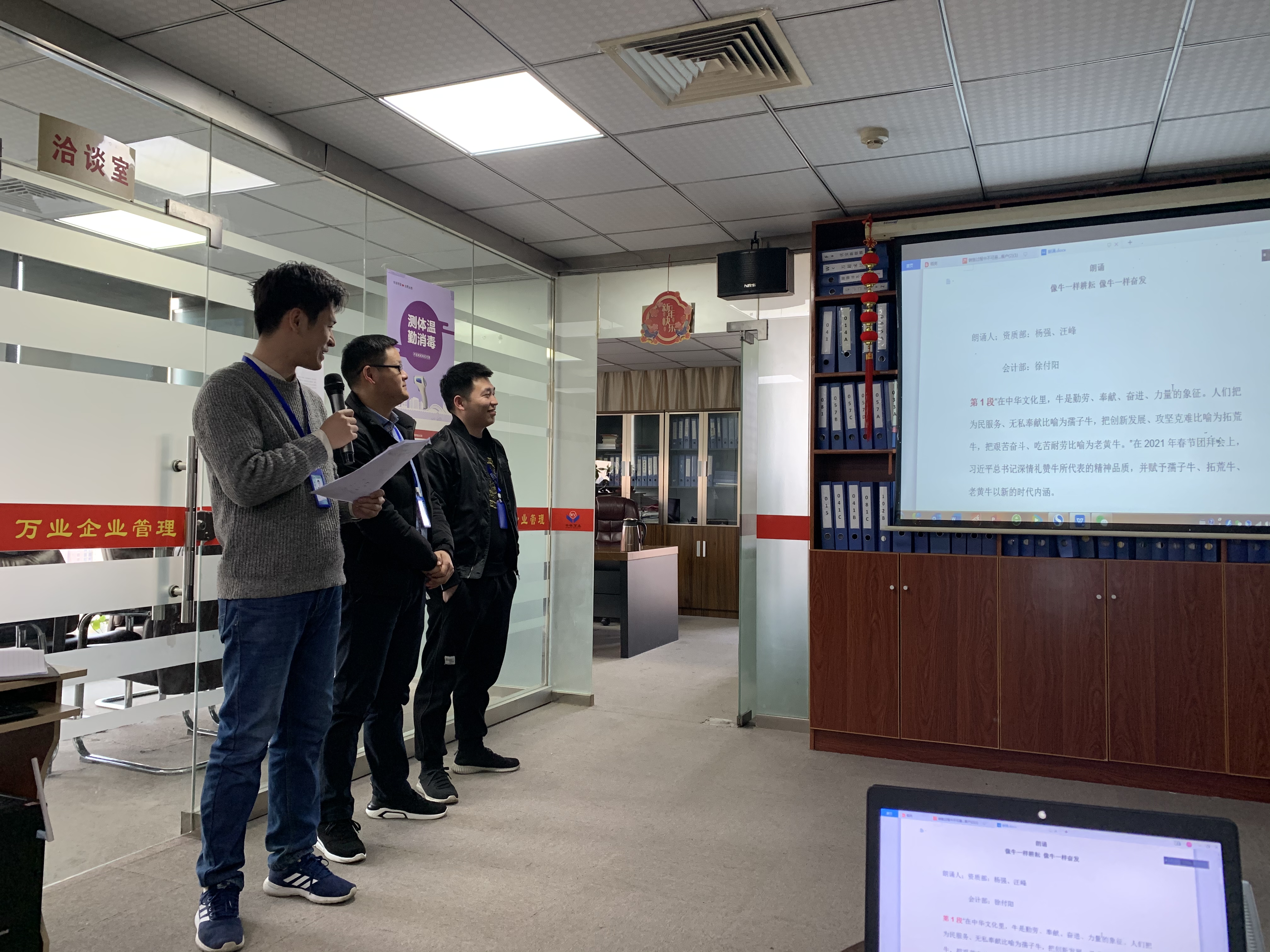資質部——汪峰、楊強,會計部——徐付陽朗誦“像牛一樣耕耘,像牛一樣奮發”